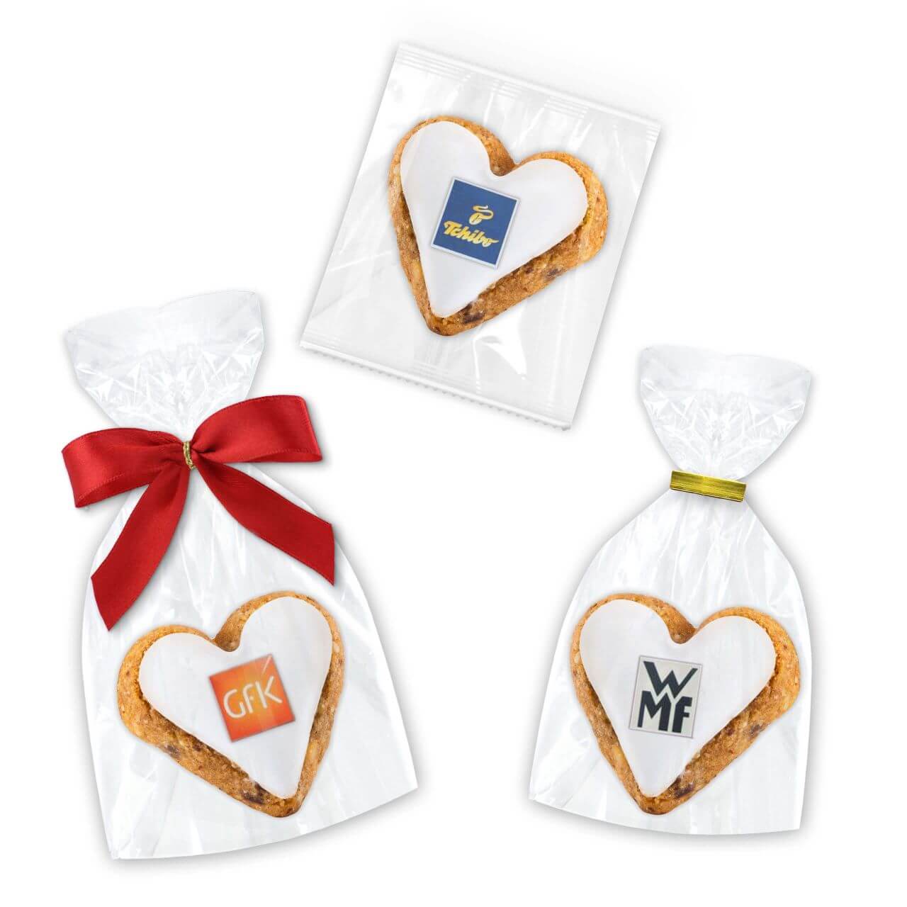In Cellophan-Tüte mit roter Schleife: ab einer Menge von 500Stk kann die Farbe der Schleife angepasst werden |