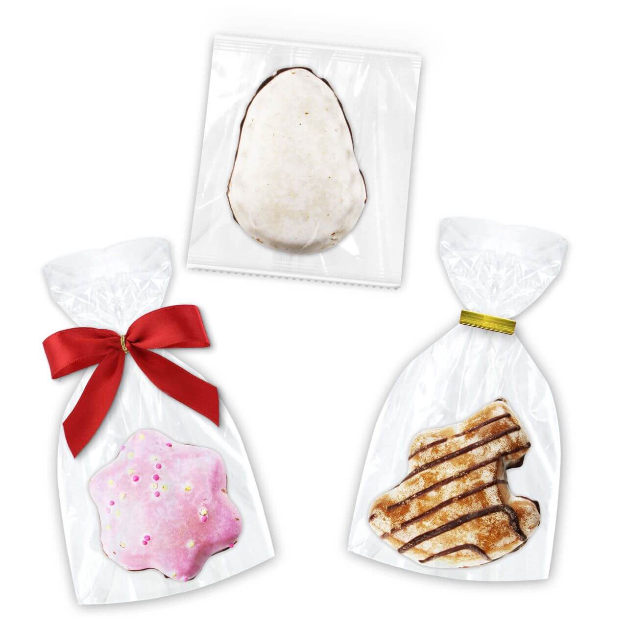 Die einzelnen Lebkuchenfiguren werden in einem transparenten Cellophan-Beutel verpackt und optional mit einer roten Schleife an der Verpackung versehen.