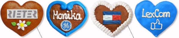 Not only are you free to choose the border, the color and the decoration, but we also label your gingerbread hearts with your desired text and optionally provide them with an edible company logo - matching your corporate design!