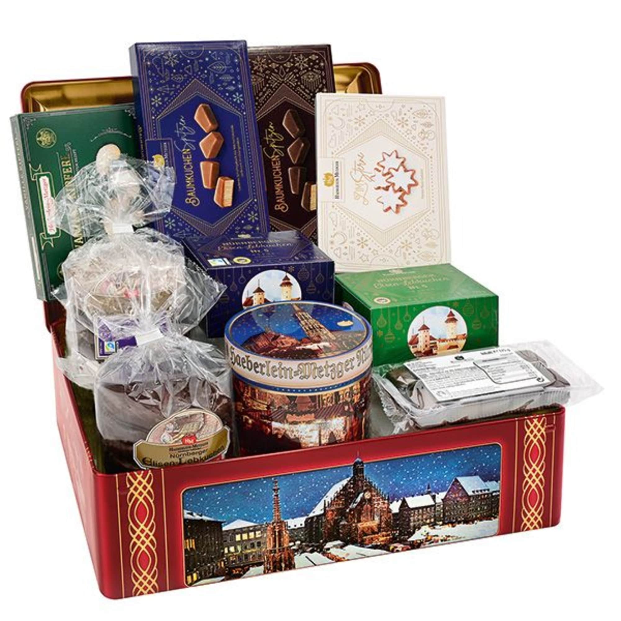 The gift chest is decorated with illustrations of the Christmas market and blue ornaments to match the Christmas season. The chest contains a delicious gingerbread mix, consisting of different types of Elisen gingerbread, a tin of gingerbread and other Christmas cookies.