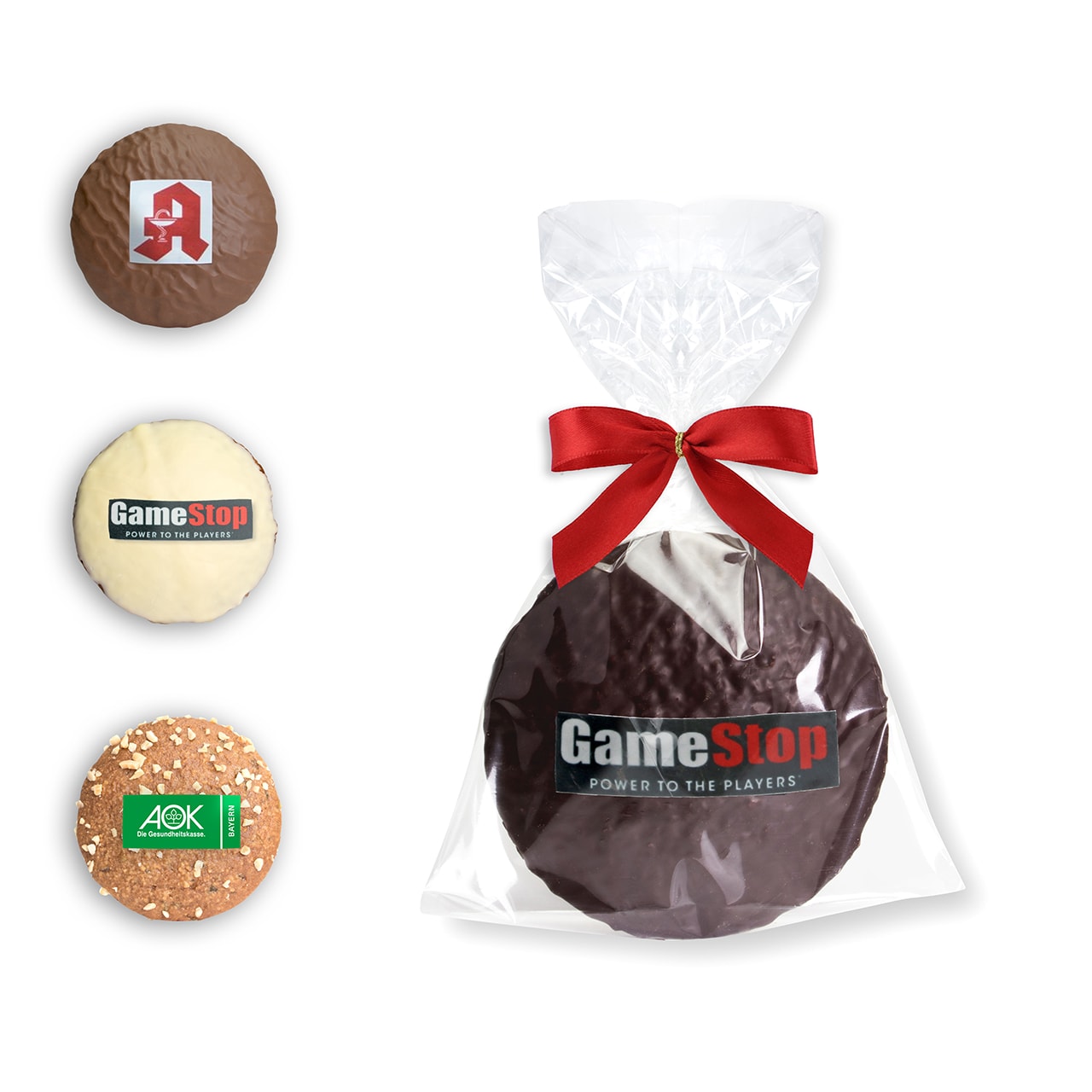 Wir drucken Ihr Logo mit Lebensmittelfarbe auf 100% essbares Zuckerpapier und dekorieren damit den Lebkuchen Ihrer Wahl. Das Logo kann rund oder eckig ausgestanzt werden.