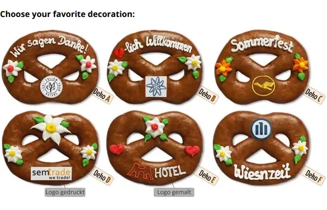 The gingerbread pretzel is decorated by hand with frosting and labeled in the color of your choice. Here you can choose from 6 designs. Optionally, we can print your company logo printed on sugar paper on the pretzel.