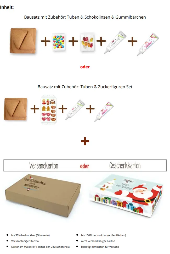 Alternativ können Sie sich für einen hübschen, vollflächig bedruckbaren Geschenkkarton entscheiden, in dem Sie das Set mit herzlichen Worten persönlich überreichen oder es verteilen können. Diese Variante eignet sich vor allem wenn Sie noch persönliche Weihnachtsgrüße beilegen möchten. Auch diesen können Sie mit Paketversand an Ihre Kunden verschicken.