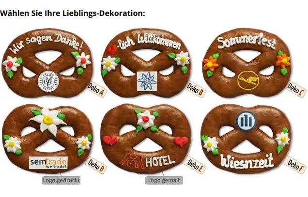 Die Lebkuchenbrezel wird von Hand mit Zuckerguss dekoriert und in der Farbe Ihrer Wahl beschriftet. Hier kann aus 6 Designs gewählt werden. Optional bringen wir Ihr Firmenlogo auf Zuckerpapier gedruckt auf der Brezel an.