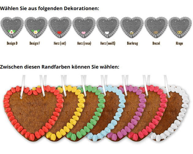 Sie können nicht nur die Randfarbe wählen, sondern das Lebkuchenherz wird mit dem Text Ihrer Wahl mit Zuckerguss handbeschriftet.