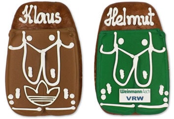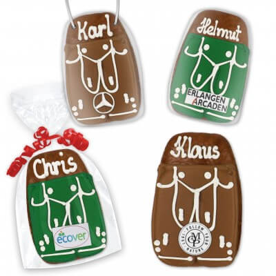 Lebkuchen Lederhose - zünftig und lecker! Nach bayerischer Tradition gibt es die Lederhose aus Lebkuchen in grün und braun. Ihr Logo wird optional auf die Hosenbeine gedruckt oder gemalt. Wählen Sie einen einheitlichen oder variierenden Text mit maximal 12 Zeichen.