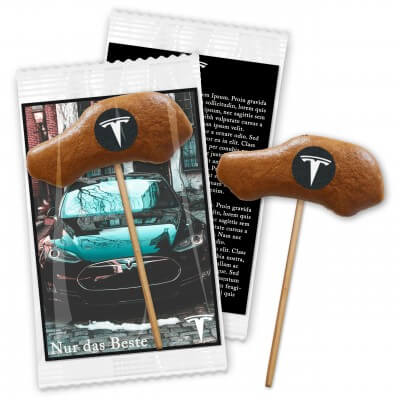 Dank dem essbaren Firmenlogo aus Zuckerpapier und der zweiseitig bedruckten Werbekarte mit Wunschmotiv erstellen Sie im Nu ein individuelles Give-Away in Ihrem Corporate Design. Das Lebkuchen-Auto am Stiel eignet sich z.B. perfekt zur Neueröffnung, Produkteinführung, Jubiläum aber auch jedem anderen Anlass.