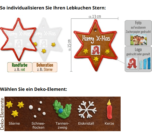| Beschreibung | Stern aus Lebkuchen optional mit Logo, 15cm, Individualisierung: Randfarbe und Schriftfarbe (alle Farb-Codes finden Sie hier) frei wählbar, maximal ein Deko-Element, Schriftzug mit bis zu 15 Zeichen, optinoal Logo oder Foto auf essbarem Zuckerpapier gedruckt (max. 40mm x 20mm). |