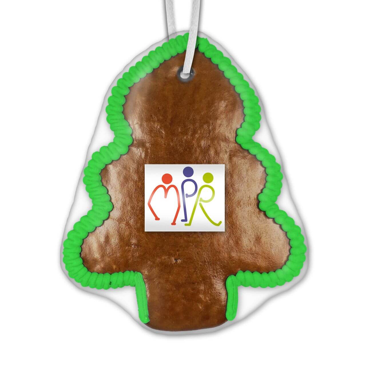 Der Weihnachtsbaum aus braunem Lebkuchen ist in transparenter Folie eingeschweißt und kommt mit einem Umhängeband und der dazugehörigen Lochung. Auf der Folie selbst bringen wir ein Label an, welches wir ganz individuell nach Ihren Bedürnissen bedrucken z. B. mit Ihrem Logo.