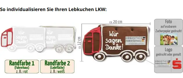 Der Lebkuchen LKW ist das perfekt Werbegeschenk um Ihre Botschaft an Kunden und Geschäftspartner zu transportieren. Machen Sie in der Logistik-Branche mit Ihren Werbe-Trucks auf sich aufmerksam. Gestalten Sie den Laster nach Ihen Wünschen, in Ihren Firmenfarben und gerne auch mit Ihrem Firmenlogo.
