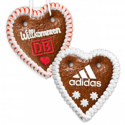 Nutzen Sie ein Lebkuchenherz als liebevolle Art um zu werben! Die Herzen werden individuell mit Ihrem Logo bedruckt, optional mit Wunschtext beschriftet und zusätzlich mit bunten Rand und Dekor Ihrer Wahl versehen. Das Beste daran: Logo und sämtliche Dekoration bestehen aus Zuckerguss - Somit kann das Lebkuchenherz direkt vernascht werden!