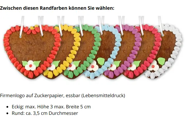 Ein Lebkuchenherz als Werbegeschenk. Sie können die Randfarbe wählen - passend zu Ihrem Corporate Design!