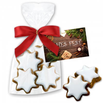 Vor allem in der Weihnachtszeit sind sie sehr beliebt: Die Zimtsterne mit ihrem würzigen Geschmack. In der transparenten Tüte eignen sie sich prima als Dankeschön für Ihre Kunden, Mitarbeiter und Geschäftspartner. Damit dieses Give-Away zum absoluten Hingucker wird, bedrucken wir eine individuelle Werbekarte für Sie, die wir an der Verpackung anbringen.