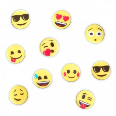 Jeder kennt Sie vom Smartphone: Die lustigen Emojis - oft auch Smileys genannt - aus den Chat Apps. Bei uns erhalten Sie die Grimassen mit unterschiedlicher Bedeutung als essbare Variante im günstigen 150er Set. Das Emoji Gesichter besteht aus bunter Zuckermasse und eignen sich ideal zum Gebäck verzieren - Perfekt für Lebkuchen, Muffin, Torte, Kuchen Cupcakes oder jedes andere Gebäck perfekt geeignet!